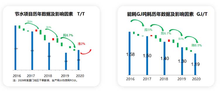 通過不懈尋求并實施節能減排方案,如更換高能耗設備為自動變頻設備,低磷清洗劑替代高磷清洗劑,污水處理站提標改造等,2016-2020年共實施節能方案154個,節水方案61個,能耗和水耗逐年下降。
